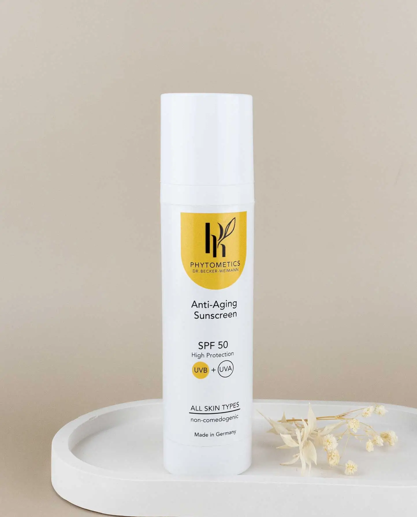 Phytometics Anti-Aging Sunscreen SPF 50 bietet umfassenden Schutz vor schädlichen Sonnenstrahlen durch moderne, sichere und innovative UV-Filter, die ein breites UVA- und UVB-Spektrum abdecken. Die sorgfältig entwickelte Rezeptur schützt nicht nur effektiv vor sonneninduzierten Hautschäden, Hyperpigmentierung und Sonnenbrand, sondern verlangsamt auch den Alterungsprozess der Haut.